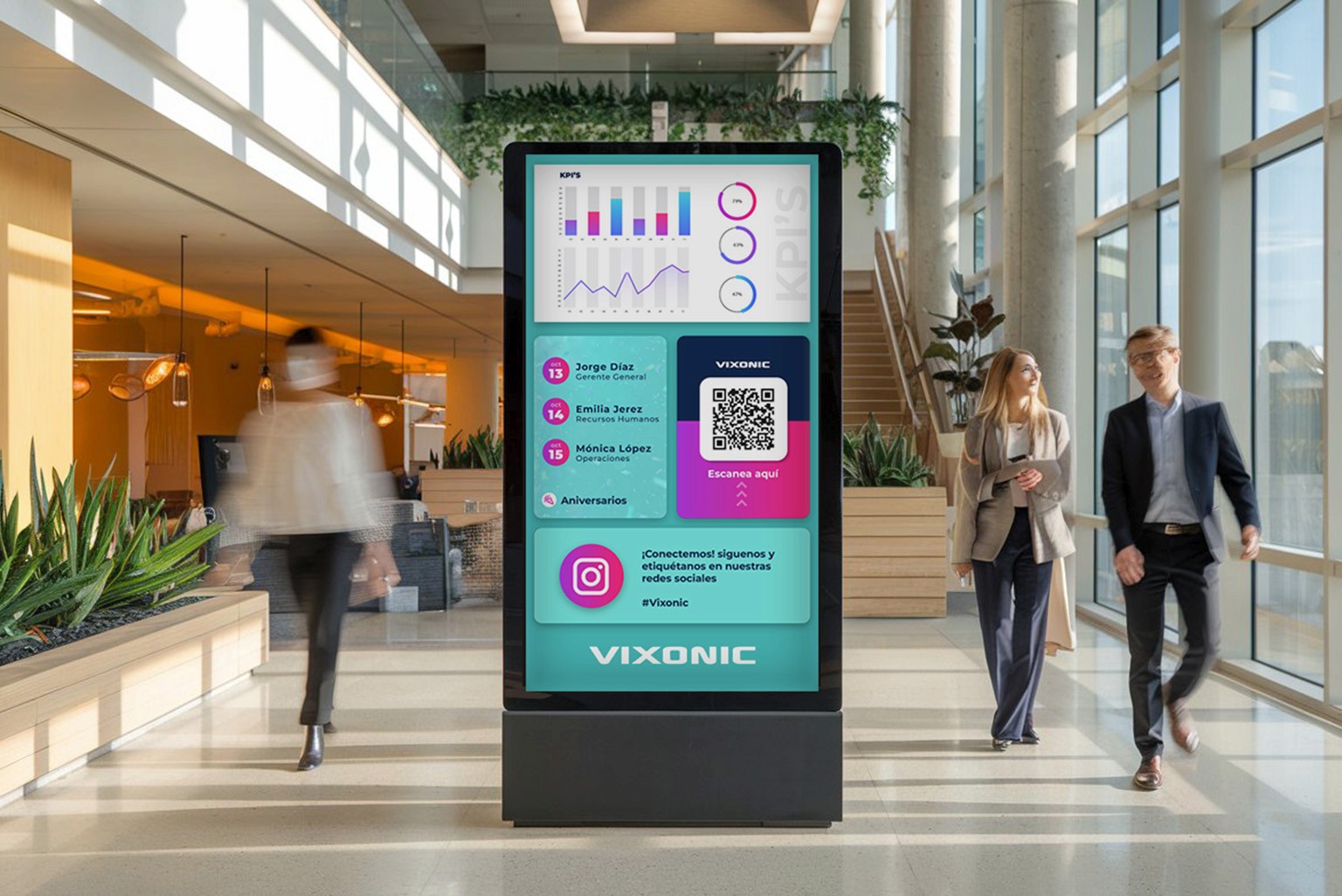 En los espacios corporativos, la señalización digital se utiliza para comunicarse con los empleados, proporcionar información y actualizaciones sobre eventos y actividades corporativas en tiempo real, anuncios de productos, información de recursos humanos, boletines de la empresa, métricas del piso de la fábrica, próximas reuniones, procedimientos de capacitación y más.
