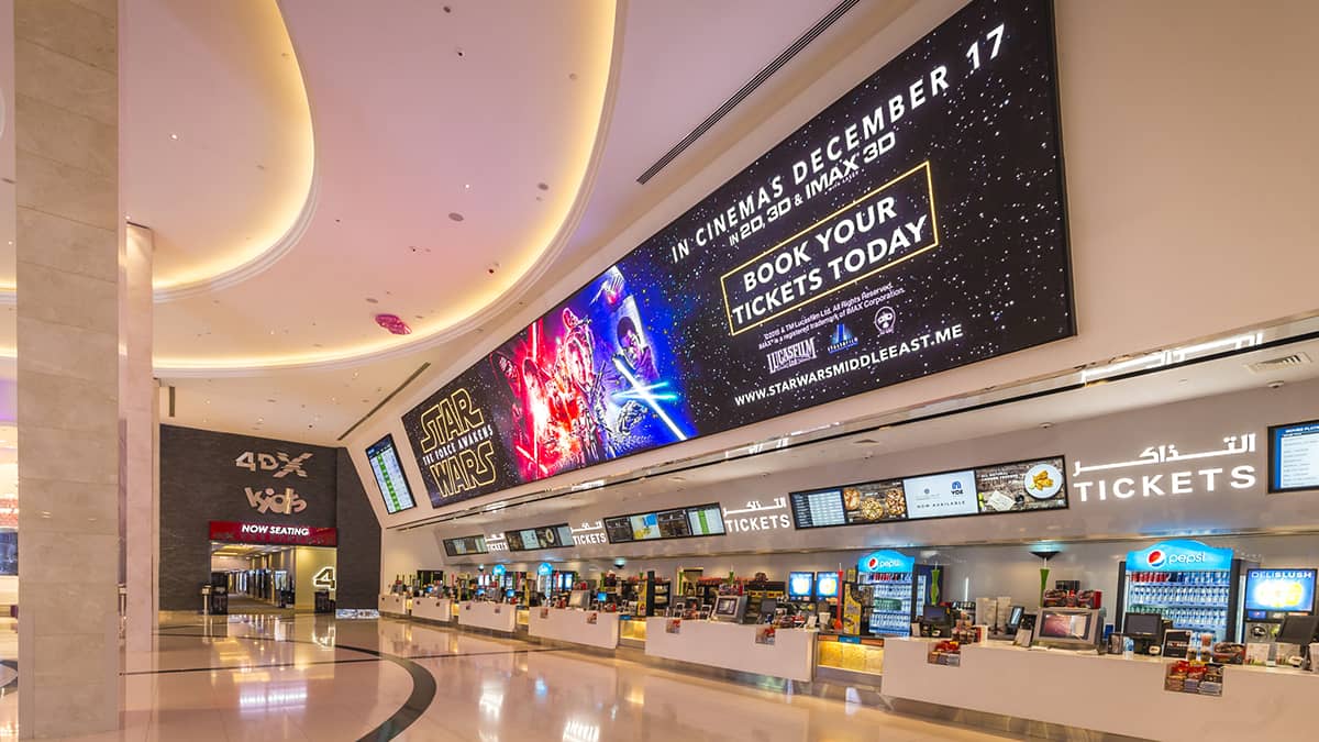 Los teatros, cines y centros de eventos especiales utilizan la señalización digital para proporcionar información relevante y actualizada sobre espectáculos y eventos, avances y para proporcionar instrucciones importantes a los invitados.