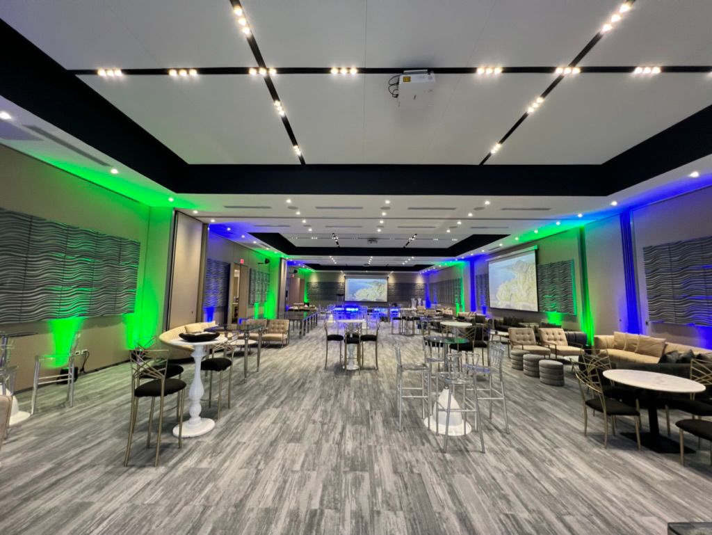 Salón de eventos diseñado con tratamiento acústico integral y un sistema de sonido de alto alcance, complementado con microfonía de alto desempeño.