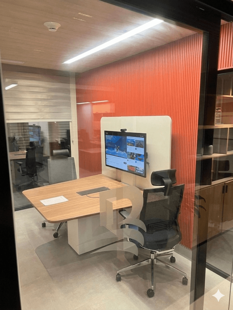 Cubículos diseñados para reuniones eficientes, equipados con cámara integrada y pantalla táctil para una interacción intuitiva.